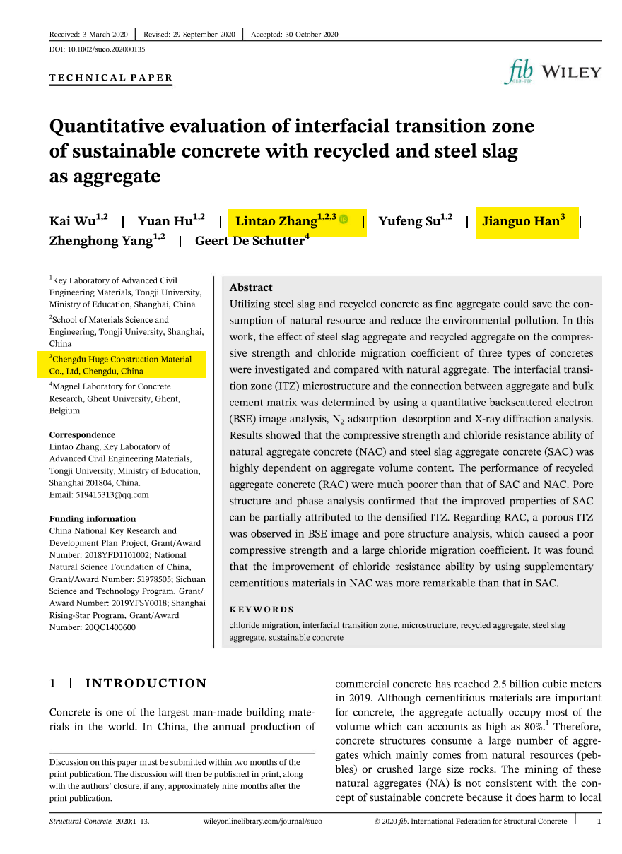 近日,我司技術(shù)團隊與同濟大學材料學院于SCI期刊《Structural Concrete》上發(fā)表Quantitative evaluation of interfacial transition zone of sustainable concrete with recycled and steel slag as aggregate的論文,該文第一作者為同濟大學吳凱副教授,通訊作者為宏基質(zhì)量管理部張林濤,合作作者為宏基質(zhì)量管理部副總工程師韓建國先生、同濟大學胡源碩士、蘇宇峰教授、楊正宏教授,比利時根特大