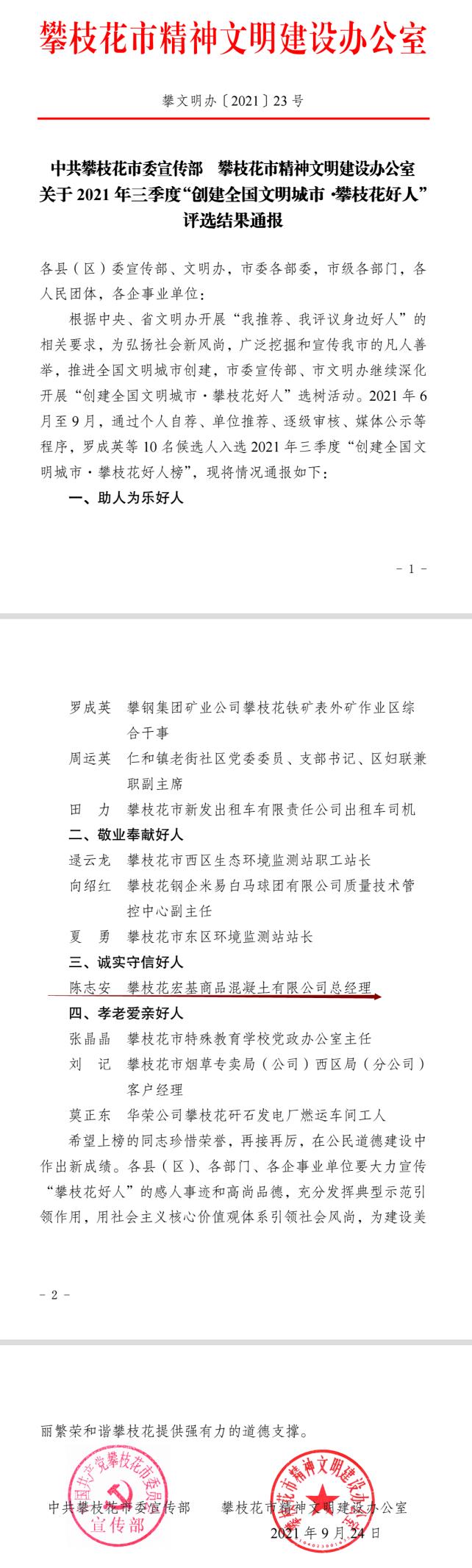 成都宏基建材股份有限公司子公司攀枝花宏基商品混凝土有限公司總經(jīng)理陳志安同志獲評(píng)“誠實(shí)守信好人”。