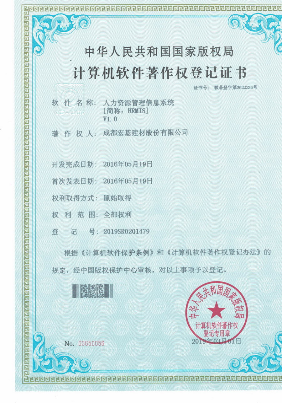 2019年3月1日,我司自主開發(fā)并實(shí)施應(yīng)用的人力資源管理信息系統(tǒng),獲得國家版權(quán)局計(jì)算機(jī)軟件著作權(quán)授權(quán)。軟件名稱:“人力資源管理信息系統(tǒng)【簡稱:HRMIS】V1.0,證書號為:軟著登字第3622236號。