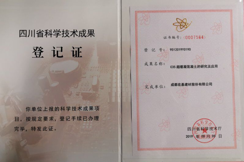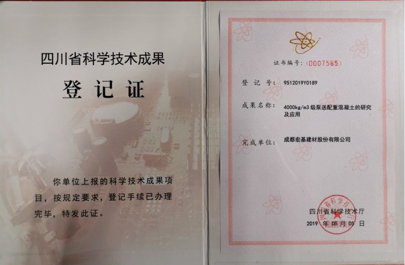 201955日,成都宏基榮獲兩項(xiàng)由省科學(xué)技術(shù)廳頒發(fā)的“國(guó)內(nèi)領(lǐng)先”技術(shù)成果登記證書(shū)。獲得此次科學(xué)技術(shù)成果登記證書(shū)的“泵送配重混凝土和超緩凝混凝土的研究及應(yīng)用”,由公司研發(fā)團(tuán)隊(duì)的技術(shù)人員共同努力完成,該兩項(xiàng)成果的研發(fā)及前期實(shí)用獲得了多項(xiàng)專利,并在地鐵、橋梁等工程項(xiàng)目中得到實(shí)際應(yīng)用,經(jīng)濟(jì)和環(huán)境效益顯著。