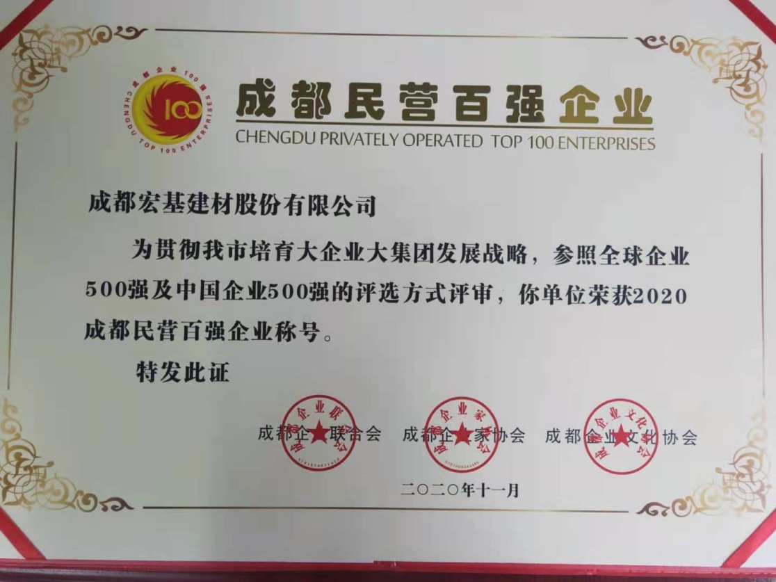 11月5日,由成都企業(yè)聯(lián)合會(huì)、成都企業(yè)家協(xié)會(huì)、成都企業(yè)文化協(xié)會(huì)(“三會(huì)合一”,以下簡(jiǎn)稱“成企聯(lián)”)舉辦的2020年第十屆成都百?gòu)?qiáng)企業(yè)發(fā)布會(huì)暨企業(yè)數(shù)字化轉(zhuǎn)型高峰論壇在蓉召開(kāi),成都宏基建材股份有限公司再次成功入圍民營(yíng)企業(yè)百?gòu)?qiáng)企業(yè)榜單。