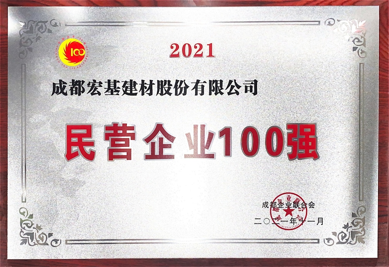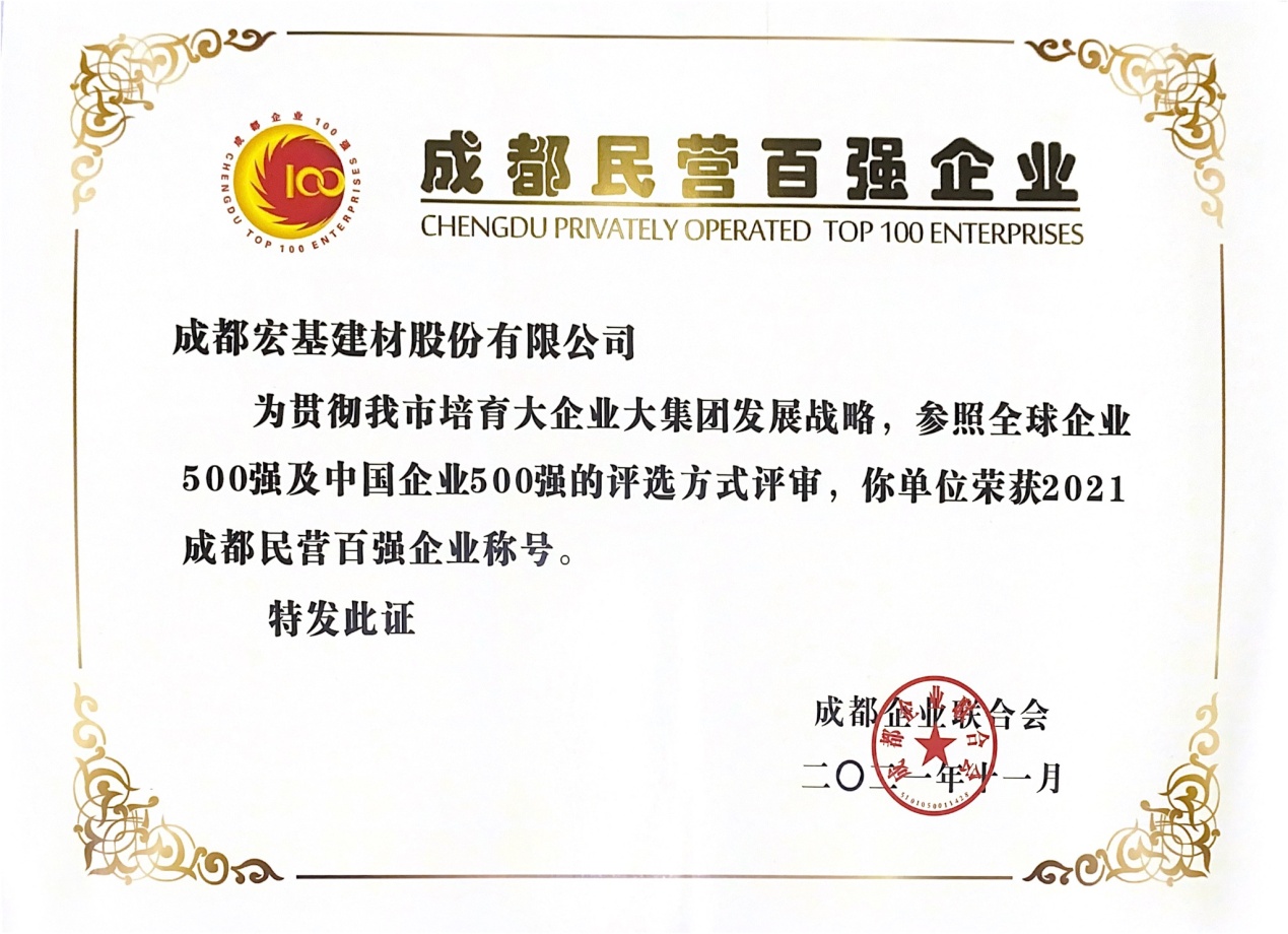 2021年,是中國共產(chǎn)黨成立100周年,也是實施“十四五”規(guī)劃的開局之年和開啟全面建設(shè)社會主義現(xiàn)代化國家新征程的第一年。為了緊扣市委市政府提出的“高質(zhì)量發(fā)展攻堅年”部署,全面實施幸福美好生活“十大工程”,開創(chuàng)成都經(jīng)濟(jì)社會發(fā)展新局面要求,成都企業(yè)聯(lián)合會開展了第十一屆百強(qiáng)企業(yè)評選發(fā)布。經(jīng)過專家委員嚴(yán)格評審,我司成功獲得“成都市100強(qiáng)民營企業(yè)”稱號。
