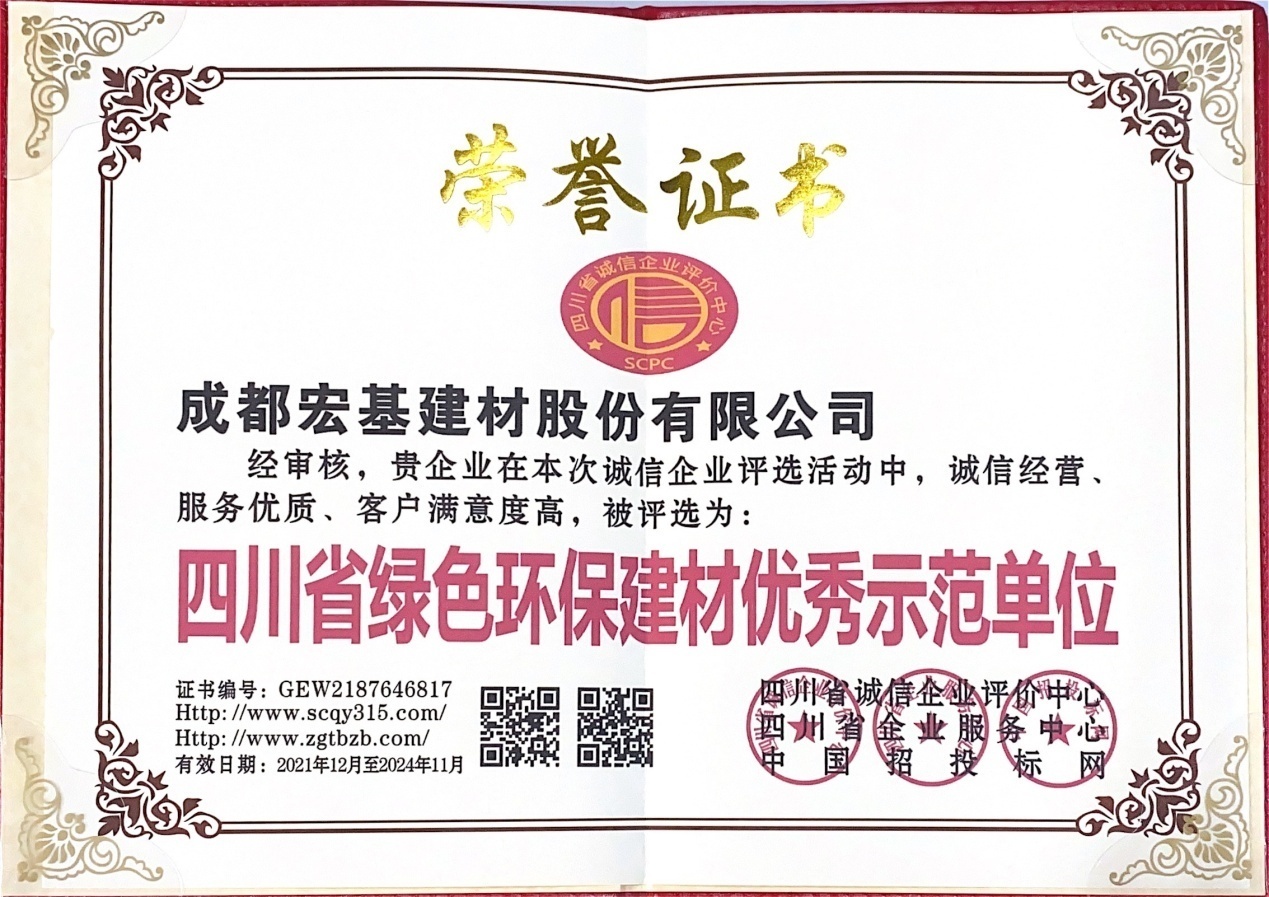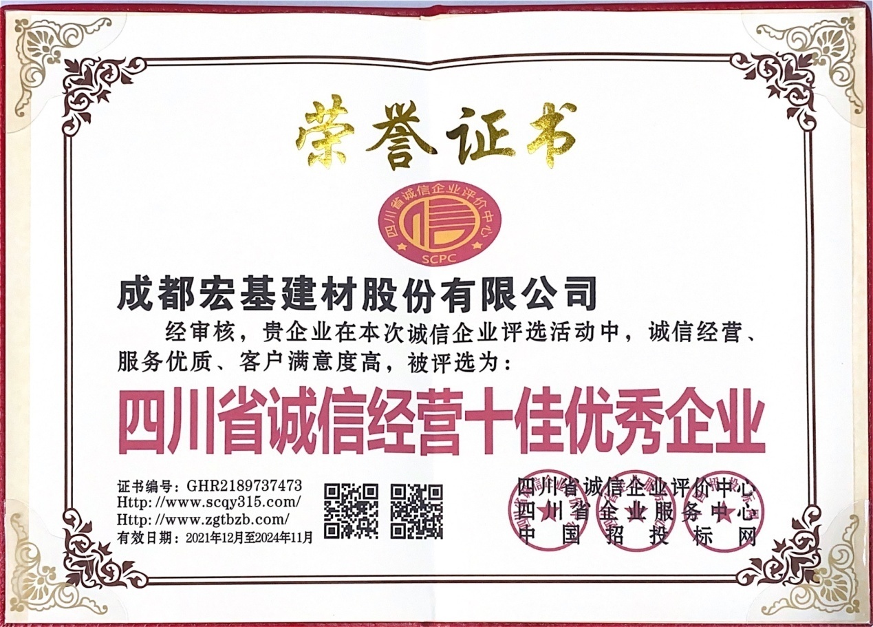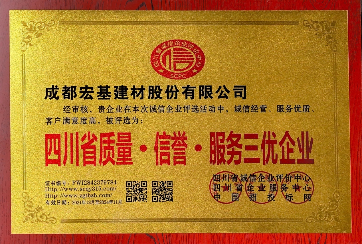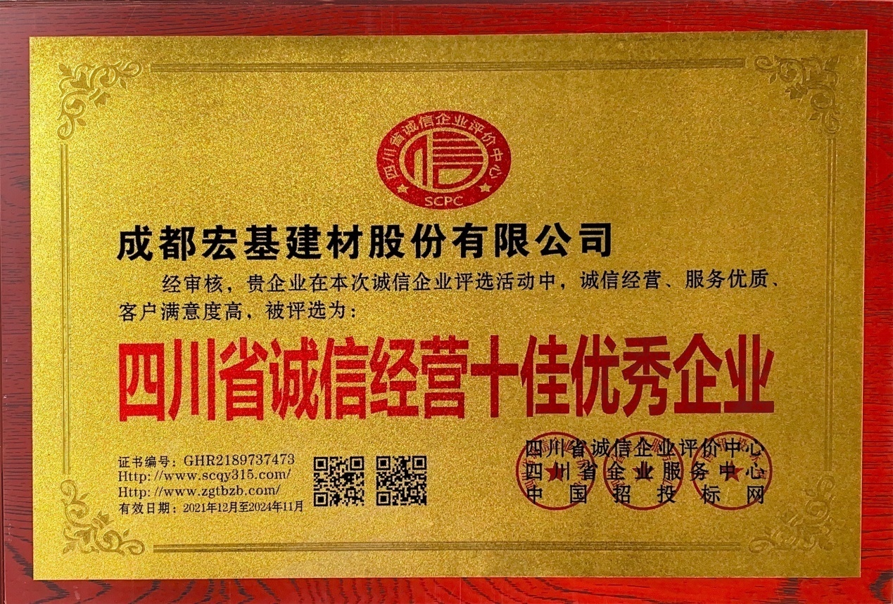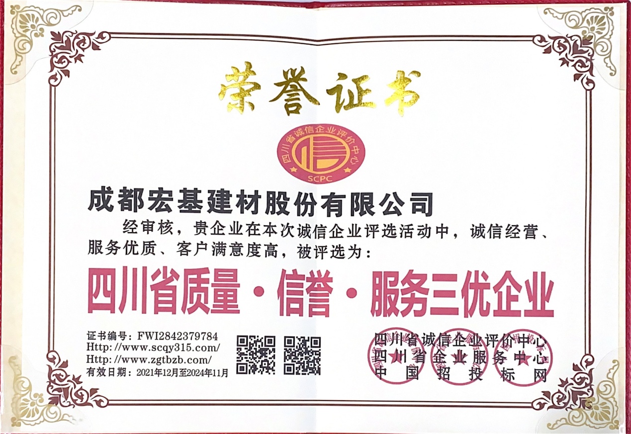 四川省誠信評選組委會(huì)秉承“公開、公平、公正”的原則,進(jìn)行了系列審查評選,公司在本次評選活動(dòng)中獲得了“四川省誠信經(jīng)營十佳優(yōu)秀企業(yè)”、“四川省質(zhì)量?信譽(yù)?服務(wù)三優(yōu)企業(yè)”、“四川省綠色環(huán)保建材優(yōu)秀示范單位”三項(xiàng)榮譽(yù)。