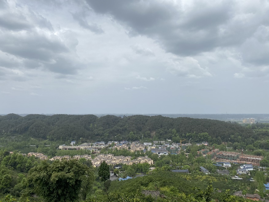 到達山頂后,山間小道變成了寬敞的柏油馬路,向下望去,蒲江縣城的風光盡收眼底。