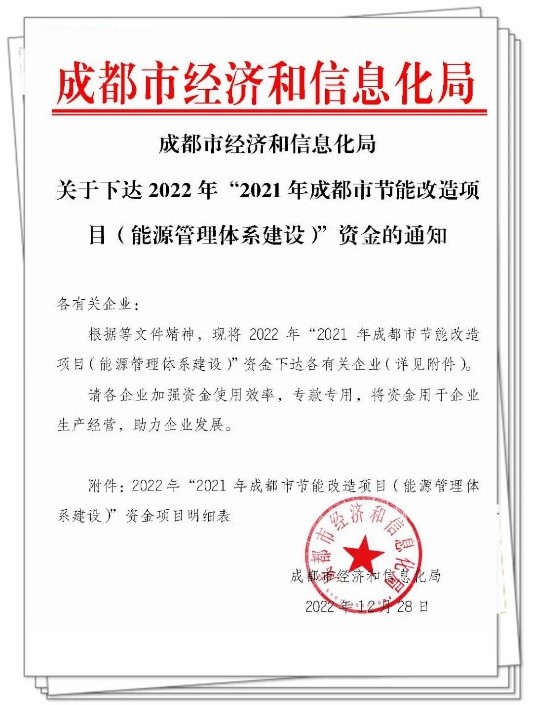 近日,我司榮獲“2021年成都市節(jié)能改造項(xiàng)目(能源管理體系建設(shè))”資金獎(jiǎng)勵(lì)。這標(biāo)志著公司能源管理體系的有效運(yùn)行和行業(yè)領(lǐng)先的體系建設(shè)邁上新臺階。