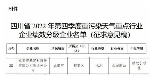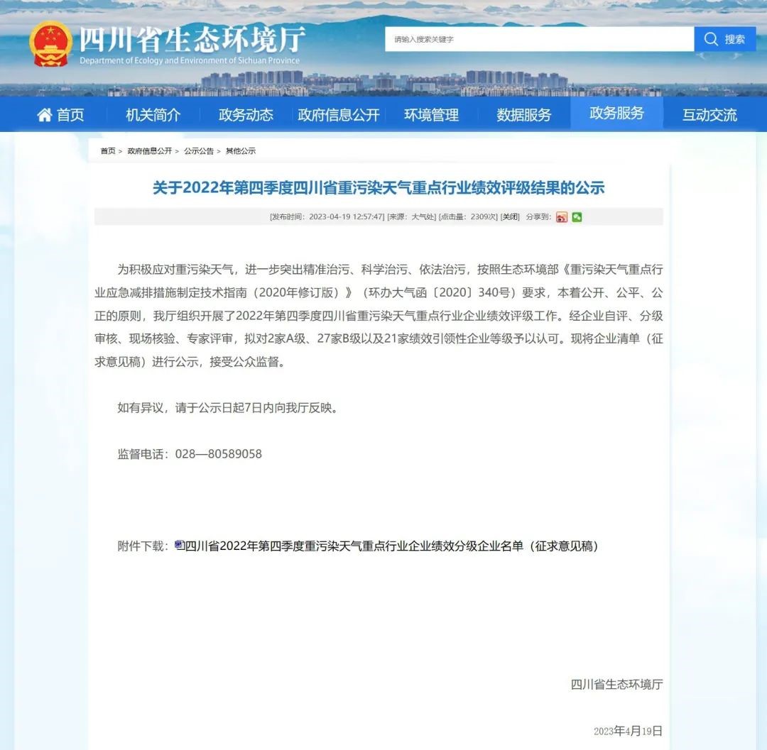 近日,四川省生態(tài)環(huán)境廳發(fā)布2022年第四季度四川省重污染天氣重點(diǎn)行業(yè)績效評級結(jié)果,我司蓉西分公司榜上有名。